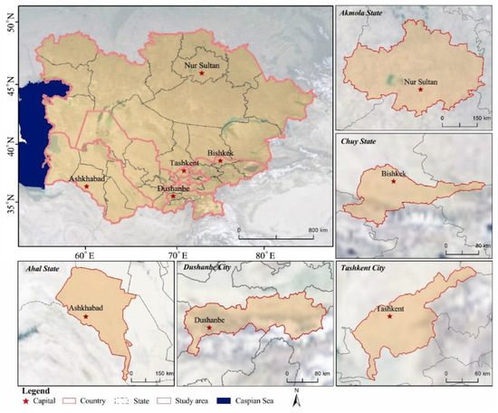 In Kazakhstan, Akmola State was selected as the study area, with an area of 15.7 × 104 km2, with a population of about 0.74 million. Nur Sultan is located in the central part of Kazakhstan, beside the ISIM river. It is the political, economic, trade and tourism center of Kazakhstan [41]. In Kyrgyzstan, Chuy State was selected as the study area, with an area of 2.2 × 104 km2, with a population of about 0.74 million. Kyrgyzstan mainly attracts foreign investment in the processing industry, scientific fields, mineral exploitation, etc., and the investment is mainly concentrated in the capital Bishkek and Chuy State [42]. In Tajikistan, Dushanbe City was selected as the study area, with an area of 3.2 × 104 km2. As the capital of Tajikistan and the most densely populated city, Dushanbe is a national transportation hub, a key city for infrastructure construction, and a major inflow of foreign investment [43]. In Uzbekistan, Tashkent City was selected as the study area, with an area of 1.7 × 104 km2. It is the main concentration of foreign-funded enterprises [44]. In Turkmenistan, Ahal State was selected as the study area, with an area of 10.2 × 104 km2. As an oasis city, Ahal State has gathered a large number of industrial enterprises in Turkmenistan. In June 2019, the world’s first natural gas-to-oil project in cooperation between Turkmenistan and Japan was put into operation in Ahal State. At the same time, Ahal State also has textile, building materials, steel and other industries, and its output value is in the forefront of the country [45]. (Figure 1). The study areas have a temperate continental climate, with hot summers and cold winters, large annual and daily temperature differences, scarce precipitation, and an arid climate.