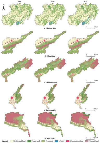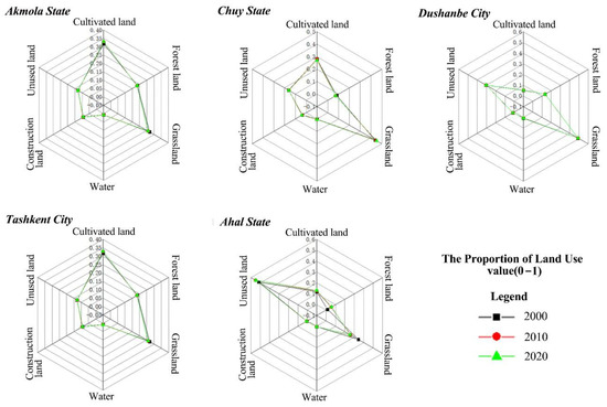 By comparing the area proportions of different land use types in five cities or states in 2000, 2010, and 2020, the dominant land use types in each city or state are significant, and grassland, unused land, and cultivated land are the three main types in general. The land use structure of these areas was relatively stable from 2000–2020, and the difference in the proportion of land type area between 2000–2010 and 2010–2020 was not significant (Figure 2). Akmola State is mainly cultivated and grassland, with cultivated areas accounting for 49–50% of the total area. Chuy State is mainly composed of grassland and cultivated land, with grassland areas accounting for 43–45% of the total area. Dushanbe City is mainly composed of grassland and unused land, accounting for 48% of the total area and 30% of the total area, respectively. Tashkent City is mainly cultivated land and grassland, which account for approximately 31–33% of the total area, and the grassland area accounts for approximately 25–27% of the total area. Unused land and grassland are the main areas in Ahal State, accounting for 51–54% of the total area.