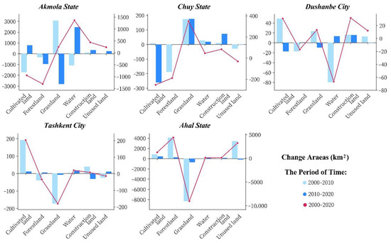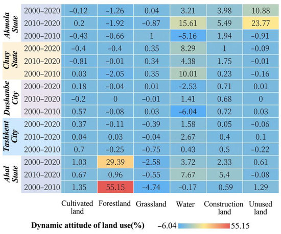 Comparing the dynamic degree changes of comprehensive land use from 2000 to 2010 and from 2010 to 2020, the dynamic degree of comprehensive land use in Akmola State and Chuy State showed an increasing trend. Among them, the dynamic degree toward comprehensive land use in Akmola State increased by 7% from 2010 to 2020. This indicates that the land-use change rate was faster in Akmola State and Chuy State during this period. The dynamic degree of comprehensive land use in Dushanbe City, Tashkent City and Ahal State showed a downward trend, among which Ahal State showed the most obvious decline, indicating that the rate of land development and utilization in Ahal State reduced.