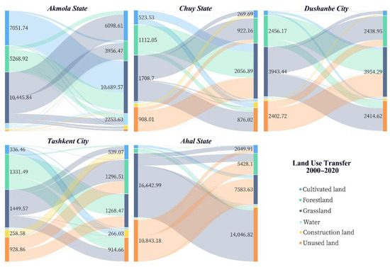 From 2000 to 2020, the area of grassland transferred out in Akmola State was the largest, and the area converted into cultivated land accounted for 49.49% of the total area of grassland transferred out, while the area from cultivated land to grassland accounted for 90.63% of the total area transferred out of cultivated land; grassland had the largest net transfer area, mainly from cultivated land and forest land. The land-use transfer pattern of Akmola State is mainly from cultivated land to grassland, supplemented by grassland to cultivated land. Chuy State has the largest area of grassland transferred out, mainly into forest land and unused land. The area from forest land to grassland accounts for 86.72% of the total area transferred out of forest land. However, the main land types transferred from grassland are forest land and unused land. Therefore, the land-use transfer pattern in Chuy State is mainly from forest land to grassland, supplemented by grassland to forest land. The land-use transfer pattern of Dushanbe City is the same as that of Chuy State. Tashkent City had the largest area of grassland transferred out, mainly into forest land and land for use, and the net transfer area of forest land was the largest, mainly from grassland and unused land. Thus, the land-use transfer pattern of Tashkent City is mainly from grassland to forestland, supplemented by forestland to grassland. Ahal State has the largest area of grassland net transfer out, and the area converted to unused land accounts for 79.87% of the total area transferred out. Moreover, the net transfer area of unused land is the largest, mainly from grassland and forest land. Hence, the land-use transfer pattern in Ahal State is mainly from grassland to unused land, supplemented by the conversion of unused land to grassland.