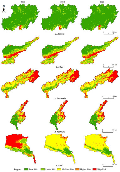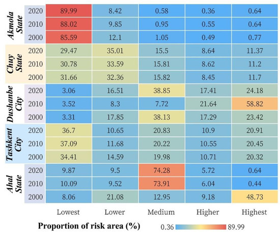 During the entire study period, the proportion of the lowest ecological risk areas in Akmola State was dominant, showing a slight growth trend, and the areas of other risk areas were reduced to varying degrees (Figure 8 and Figure 9). From 2000 to 2020, Chuy State was dominated by lowest-risk and lower-risk areas. During the study period, the lowest-and medium-risk areas decreased, the lower-risk and higher-risk areas increased, and the highest risk area decreased in 2010 but increased in 2020. Dushanbe City had the largest proportion of medium risk areas in the year 2000. In 2010, the areas of lower risk areas and medium risk areas decreased significantly, while the areas of higher risk areas and highest risk areas increased significantly, with the area of highest risk areas accounting for 58.82%. Throughout the study period, Tashkent City had the largest proportion of lowest-risk areas, followed by the highest risk areas, while the area of lower risk areas decreased during the study period, and the area of other risk areas increased. The increase from 2010 to 2020 is greater than that from 2000 to 2021. In 2000, the area of highest risk areas in Ahal State accounted for the largest proportion, followed by lower risk areas; from 2000 to 2010, the area of medium risk areas increased significantly, and the area of highest risk areas decreased significantly; from 2010 to 2020, the area changes of risk areas at all levels remained basically stable.