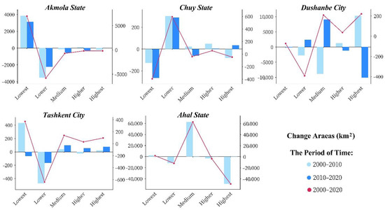 During the study period, the range of land use change was largest in Ahal State and smallest in Dushanbe City (Table 1).