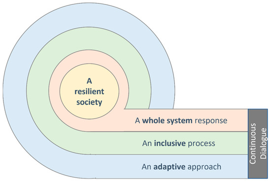 - A continuous dialogue: Adaptive plans and priorities change in unexpected ways. Mutual learning and an iterative process of deliberation to evolve priorities and actions are central to the success of continuing to maintain societal resilience. During the continuous dialogue, the complexity and behaviour of the whole system are discussed by the stakeholders. Stakeholders will also share their respective knowledge and explore the barriers and opportunities for a resilient future. Practical questions are: How will future choices be made; who will make them? Which foundations have been laid for those future choices to remain under review, as stakeholders, preferences and experiences change?