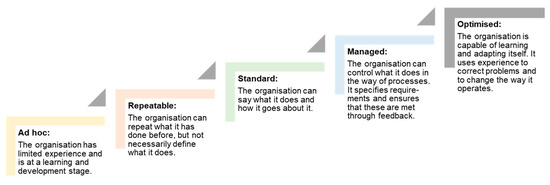 - Paulk, M.C.; Curtis, B.; Chrissis, M.B. Capability Maturity Model for Software; Carnegie-Mellon University Pittsburgh Pa Software Engineering Institute: Pittsburgh, PA, USA, 1991. [Google Scholar]