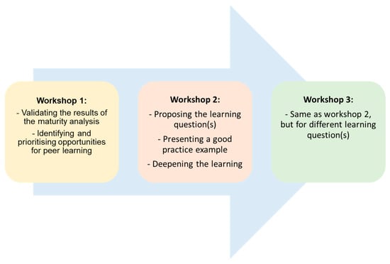 Despite the heterogeneity of the NSR, governmental authorities face common challenges that impede the translation of Cloud to Coast adaptation into policy and practice. Through its peer learning workshops (Figure 3), C5a created the opportunity for mutual learning between the governmental authorities. These workshops helped them to collectively identify and address the challenges for improving on the main pillars of Cloud to Coast adaptation. Peer learning offers many advantages as a tool to accelerate learning [], some of which are relevant to co-creating the Cloud to Coast approach. For example, it can explicate systems principles—helping to separate ‘the wood from the trees’. It also provides an environment for surfacing assumptions and exploring mental models outside of the normal experience of individual organisations—helping to prevent the ‘not invented here’ effect. However, the success in accelerated learning depends on issues such as trust building and network operating processes []. This requires skills around network brokerage, facilitation and benchmarking. In C5a, these skills were provided by the researchers, who took the lead in the preparation and facilitation of the peer learning workshops. For the first workshop, they collected, analysed and presented the results of the maturity analyses. This workshop hosted 19 participants (all online) from 10 organisations. It served as a validation step to ensure consistency in the interpretation of and judgement on maturity. The validated results were then used in the next peer learning workshops. By comparing the maturity per main pillar between governmental authorities, the opportunities for peer learning were identified. Accounting for mobility and travel restrictions posed by the COVID-19 pandemic, the workshops were organised online or in-person. The second workshop hosted 19 participants (of which five were online and 15 in-person) from 10 organisations and the third 13 participants from seven organisations. Each workshop started with the introduction of a prioritised learning question by the proposer, together with a good practice example presented by the responder. This was followed by a break-out session in which the involved experts had more in-depth discussions, thereby deepening the learning. This sometimes involved discussing another good practice example or showcasing a (software) tool relevant to a main pillar.