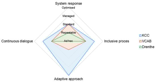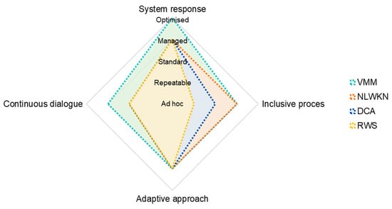 The maturity of each governmental authority involved in the case studies in adopting a Cloud to Coast approach has been assessed using a maturity analysis. Maturity is a measurement of the ability of an organisation for continuous improvement in a particular discipline. One such discipline is infrastructure asset management (IAM) [], including assets used for flood protection. Volker et al. [] reviewed the use of maturity models in the context of IAM. They concluded that there are various types of models, but most were optimised for other domains and therefore unsuitable for IAM. Nevertheless, the maturity analysis concept has evolved from an appraisal method for software processes [] to being widely used across a range of areas, including for IAM [,,,]. In the Interreg NSR project FAIR, the maturity analysis concept has been used by governmental authorities to consider best practices and competencies for IAM for flood protection and to understand the need for and effectiveness of the AM processes they use [].