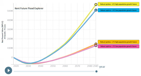 - Example #4: Providing meaningful decision support for flood risk changes and influence: Within Kent (UK), the Future Flood Explorer (FFE) [] provides a window into present day flood risk, including not only economic damage but also social vulnerability [], and how these risks may change with 2 and 4 °C rises in global mean surface temperature, low and high socioeconomic growth projections and the benefits and costs associated with alternative adaptation portfolios. By exploring a wide range of alternative adaptation portfolios (including a continuation of current policies as well as an enhanced and reduced adaptation effort), the FFE enables a portfolio-based optimisation of investment, taking into account how the risks and the benefits of adaptation vary across Kent (Figure 6). In doing so, the Kent Future Flood Explorer illustrates how robust adaptation choices can be made that work well across multiple futures. It helps provide the ‘push’ to action by providing evidence on the present and future flood risk given alternative pathways.