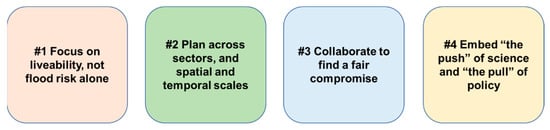 The conventional response to managing flood risk has been to deliver project-based infrastructure responses, focusing on levees and dikes. However, a local ‘defence only’ paradigm is unlikely to manage flood risk over the short to long term and promote liveable places, ecosystem health and social well-being []. There is a general acceptance that adaptation and sustainable development can only be addressed successfully through collective action that integrates natural and built infrastructure. The continued evolution of the approach to managing flood risks is needed based on an adaptation process that is collaborative and takes a whole-system, long-term view.