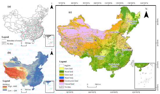 Map of the study area ((a): prefecture-level and above cities of China, (b): DEM of China, (c): LUCC and six regions of China).