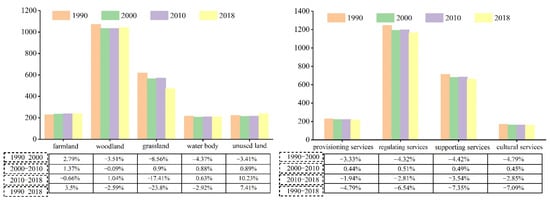 According to the results of the ESV evaluation model, the total ESV in the study area in 1990, 2000, 2010, and 2018 was 23.54, 22.53, 22.64, and 21.97 trillion yuan, respectively. During the study period, the total amount of ESV decreased by 6.67%, with an average yearly decline rate of 0.24%. Figure 3 shows how the ESV produced by various land use types and ecosystem subservice structure alterations varied. From the perspective of various land use types, the ESV produced by woodland was the largest, followed by grassland, farmland, unused land, and water body. The ESV generated by farmland and unused land increased by 3.50% and 7.41%, respectively, whereas the ESV of other land types decreased, especially grassland, which decreased by a total of 23.80%. From the perspective of various ecosystem subservice structures, the ESV generated by the four ecosystem service structures was in the following order: regulating services > supporting services > provisioning services > cultural services. The change trend was consistent across the three research periods, showing a trend of initially decreasing, then increasing, and finally decreasing. During the whole study period, supporting services saw the greatest decrease in ESV, with a total decrease of 7.35%, whereas provisioning services experienced the least decrease, with a total decrease of 4.79%.