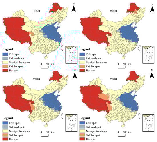Spatial distribution of cold and hot spots of ESV in China from 1990 to 2018.