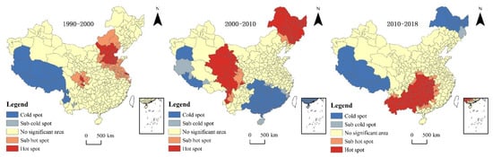 To further explore the temporal and spatial distribution characteristics of ESV changes in China from 1990 to 2018, the cold and hot spot map in the change of ESV in the study area was described again with the use of a hot spot analysis tool (Figure 6). From 1990 to 2000, the cold spots were primarily distributed in Tibet, the sub-cold spots were distributed in Yuxi City, the hot spots were primarily distributed in north China, and the sub-hot spots were widely distributed in north China, the eastern coast, and the southwest; From 2000 to 2010, the cold spots were primarily distributed in the south, whereas the sub-cold spots increased slightly, primarily distributed around the cold spot area. In comparison with the stage from 1990 to 2000, the number of hot spots increased significantly, and the degree of aggregation also increased, mostly distributed in Qinghai, Sichuan, and Heilongjiang Province. The number of sub-hot spots decreased significantly and scattered around the hot spots; From 2010 to 2018, the regional distribution of cold and hot spots changed significantly. Cold spots were mainly distributed in Tibet and some areas of Heilongjiang and Inner Mongolia in the northeast. The number of sub cold spots decreased, with the majority of them concentrated in Mudanjiang City. The spatial distribution of hot spots was concentrated mostly in the central and southwest areas. The number of sub hot spots slightly increased compared with the previous stage, and was primarily distributed in the central area.