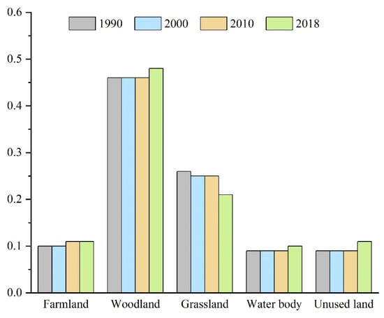 On the basis of the land use data of four periods in 1990, 2000, 2010, and 2018, the land use transfer matrix in China was calculated, and the transfer chord diagram between different land use types was created (Figure 2). During the study periods of 1990–2000, 2000–2010, 2010–2018, and 1990–2018, the evolution characteristics of various land use types in the study area were analyzed. The results showed that throughout each time, the area of each land type in the study area changed to varying degrees. Woodland and grassland were always the two primary land types. Specifically, the change in grassland net area always showed a decreasing trend. The net area declined by 12.71% across the study period. Especially from 2010 to 2018, the net area of grassland dropped by 11.4% and mostly shifted to farmland, woodland, and unused land; Over the study period, the change in woodland was relatively moderate, with a steady decreasing trend from 1990 to 2000, followed by a slowly increasing trend from 2000 to 2018; From 1990 to 2000, the net area of farmland increased by 1.61%, whereas from 2000 to 2018, it began to slowly decrease, with most of the land being moved to woodland, grassland, and construction land; From 1990 to 2010, the unused land and water body changed steadily, whereas the increase from 2010 to 2018 showed an increasing trend, with increases of 11.39% and 6.07%, respectively; The change in construction land was the most significant, and the change rate continued to increase throughout the three study periods. The change rate of construction land reached 34.95%, particularly from 2010 to 2018.