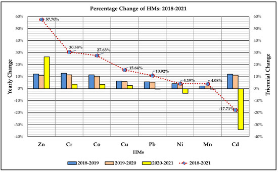 Figure 1. For Zn, Cr, Co, and Cu, there are only positive yearly percentage changes, while Pb, Ni, Mn, and Cd seem to have positive yearly percentage changes from 2018 to 2020, but in 2021 a decline appears among them. Furthermore, referring to the triennial percentage change, the greatest changes happened in Zn and Cd. To focalize, Zn skyrocketed by about 58% during 2018–2021 at the imaginary triangle (s1–s10); on the contrary, Cd plummeted by 18% at the imaginary triangle and in residential samples (s39–s53).