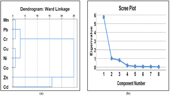 Figure 2a. In this figure, it could be assumed that there are two major groups, the first of which is composed of two subgroups. The first major cluster has two subclusters, the first subcluster contains Mn, Pb, and Cr, while the other one incorporates Cu, Ni, and Co. The first subcluster (Mn, Pb, and Cr) shows an intense relation between the HMs, while the second one depicts a similar pattern as well, between the HMs (Cu, Ni, and Co). This occurrence may assume a similar source. The second major cluster encloses Cd and Zn; however, there is no intense relation between the two HMs; this phenomenon may put into question the probable different—anthropogenic or natural—source(s). Hence, cluster analysis suggests at least two (and possibly three) different sources of heavy metals.