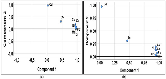 The first component is made up of Cu, Mn, Pb, Ni, Cr, and Co because they have values above 0.9, but Zn and Cd are excluded from the first component with values below 0.5. Then, the second principal component consists of Zn and Cd; however, Zn shows a slightly peculiar pattern between HMs, as can be shown in