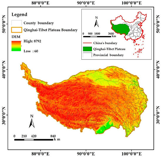 The Qinghai–Tibet Plateau, known as “the Roof of the World”, is a typical plateau region, and is a “river source” and “ecological source” of China, as well as South Asia and Southeast Asia. Playing a role as the “initiator” and “regulator” of climate change in Asia and even the northern hemisphere, it is of great ecological importance. The QTP is distributed across nine countries; China, India, Pakistan, Tajikistan, Afghanistan, Nepal, Bhutan, Myanmar, and Kyrgyzstan. The study area in this paper is the part within China, ranging from 25°59′37″ N to 39°49′33″ N, 73°29′56″ E to 104°40′20″ E, covering an area of about 2542.30 × 103 km, with an average altitude of 4000 m above sea level, covering all or part of 6 provinces and regions of Tibet, Qinghai, Gansu, Sichuan, Yunnan and Xinjiang, involving a total of 216 county units (Figure 1). In 2019, there were more than 14 million permanent residents in the QTP, accounting for about 1% of the total across the country, with a resident population density of about 5.4 people/km2, and the only cities with a population of over 1 million were Xining, Haidong, and Garze Tibetan Autonomous Prefecture. In 2019, the QTP had a GDP of over RMB 600 billion and a per capita GDP of about RMB 44,051, much lower than the national average of RMB 69,235, making it a typical sparsely populated area with lagging economic development.