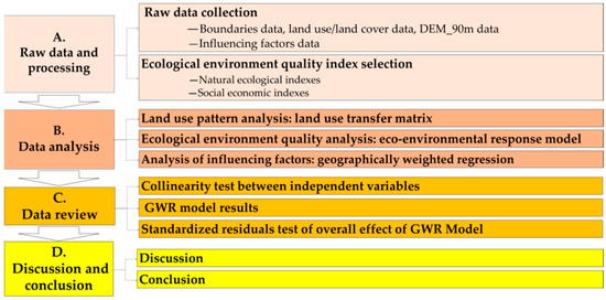 This paper mainly includes four steps. The first step is about raw data and processing, aiming to construct a junction table between PLES and land-use type, and to perform data computation and processing of land-use transfer matrix, ecological environment response model, and GWR based on arcgis10.2, python, and excel. The second step is data analysis, which is committed to analyzing the evolution characteristics of PLES, EEQI, and influencing factors of EEQI. The third step presents a data review to evaluate the GWR model for independent variable multicollinearity and operational parameters, and analyze the standardized residuals of the influencing factors as well as spatial differences. The fourth step is the Discussion and Conclusions (Figure 2).