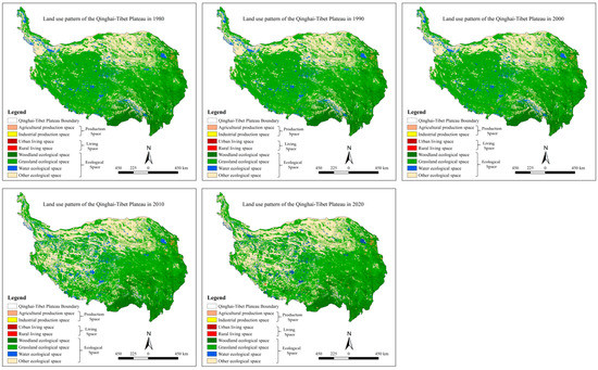 In this paper, by reclassifying the land use/land cover data of the QTP from 1980 to 2020 by arcgis 10.2, we get the PLES distribution maps of the QTP for five time-points of 1980, 1990, 2000, 2010, and 2020 (Figure 3). In 1980, production space and living space accounted for a small proportion of the PLES of the QTP, and they were mainly located in the northeast and southwest, in a patchy distribution. The ecological space accounted for a large share, with ecological space of grassland and woodland mainly distributed in the west, east, and south, and other ecological space mainly in the north and northwest. The PLES in 1990 and 2000 showed similar distribution characteristics to those in 1980, presenting a general stabilization with insignificant changes. In 2010, production and living space in the PLES of the QTP increased obviously, while ecological space decreased. In particular, the grassland ecological space decreased sharply, while the land for other ecological spaces increased significantly, with the area changing mainly in the central and western regions of the QTP. The spatial distribution of PLES in 2020 was generally stable compared with that in 2010, with no significant changes.