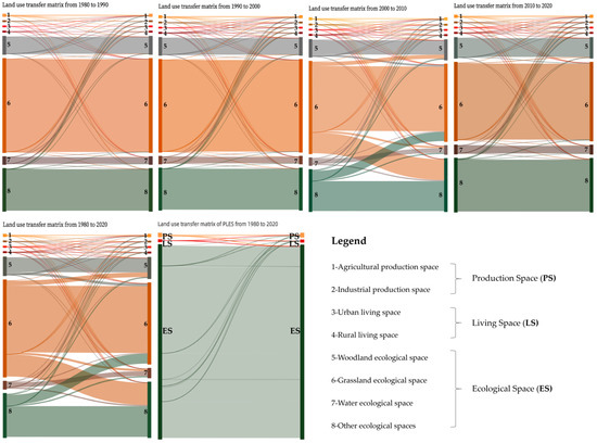 By overlaying the land use/cover data of different years of the QTP based on Arcgis10.2, in this paper, we have obtained the land transfer area for the four time periods of 1980–1990, 1990–2000, 2000–2010, and 2010–2020, have constructed the land use transfer matrix (for details see attached Table A1, Table A2, Table A3, Table A4 and Table A5), and created a land use transfer matrix Sankey diagram (Figure 4). The PLES transitions in the QTP from 1980 to 1990 and from 1990 to 2000 showed essentially similar characteristics, dominated by a shift from ecological space to production space and living space. During the period, the QTP saw a slight increase in the living space and production space, while a slight decrease in the grassland area in ecological space by about 10,348.8 km2, mainly transformed into other ecological space, agricultural production space, and water space. The PLES of the QTP from 2000 to 2010 showed the most significant transition characteristics, also with a shift from ecological space to production space and living space. For ecological space, the largest reduction was found in grassland ecological space, by about 445,463.07 km2, mainly transformed into other ecological space, woodland ecological space, and water ecological spaces. The PLES of the QTP from 2010 to 2020 continued the same transition, still dominated by the shift from ecological space to production and living space, with a decrease in intensity. In the ecological space, grassland ecological space was reduced by 24,924.18 km2, and the reduction was mainly transformed into woodland ecological space and other ecological spaces.