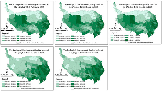 Spatial distribution of EEQI in the QTP from 1980 to 2020.