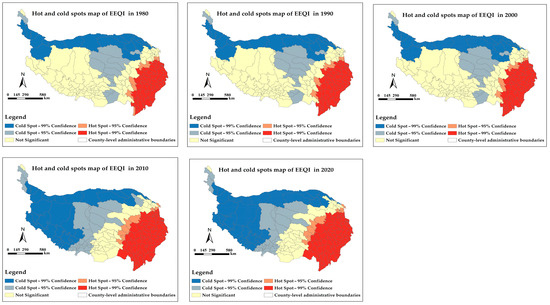 Spatial distribution of hot and cold spots of EEQI in the QTP from 1980 to 2020.