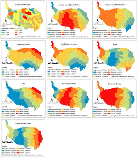 Spatial distribution of standardized residual and regression coefficients of driving factors.