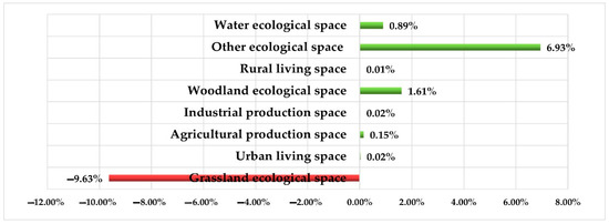 The EEQI is used to measure regional eco-environmental quality, reflecting the changes in eco-environmental quality in the region, which may improve or deteriorate [56,57,58,59]. From 1980 to 2020, the EEQI of the QTP decreased from 0.5634 in 1980 to 0.5038 in 2010 and then increased to 0.5044 in 2020, showing a trend of decrease and then increase (Table 4). During that period, the transformation of grassland ecological space to other ecological spaces was a major factor leading to QTP deterioration of eco-environment, accounting for 82.608% of the total contribution. The conversion of other ecological space to grassland, woodland, and water ecological space was a major factor resulting in eco-environmental improvement, accounting for 93.199% of the total contribution. Agricultural and industrial production space, as well as rural and urban living space, had little influence on the improvement or deterioration of eco-environmental quality, accounting for a small share of the total contribution (Table 5). In general, from 1980 to 2020, the contribution rates of eco-environmental improvement and deterioration of eco-environmental quality in the QTP regions were 0.05 and −0.1, respectively, with the deterioration of eco-environmental quality over the improvement. Therefore, the EEQI of the QTP showed a downward trend.