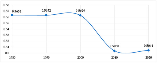 In this paper, the EEQI of 216 county-level administrative regions in the QTP was calculated and visually expressed through the arcgis 10.2 platform (Figure 5). The high EEQI area in the QTP in 1980 was mainly in the midwestern and southeastern regions, while the low-value area was mainly distributed in the northern, northwestern, and central parts, showing a bi-center spatial distribution. The distribution characteristics of the high and low EEQI areas in 1990 and 2000 were similar to those in 1980, and generally tended to be stable. In 2010, the spatial distribution of EEQI in the QTP changed greatly, with a slight increase in the north, a significant decrease in the high-value areas in the west, and a significant increase in the east, markedly “low in the west and high in the east”. The spatial distribution of EEQI in the QTP in 2020 had no significant change, except for an increased number of high-value areas, which were mainly distributed in the east and southeast. The distribution of high EEQI areas in the QTP from 1980 to 2020 changed from a bi-center in the midwest and southeast to a monocenter in the east, with a significant decline in eco-environmental quality in the west, with an improvement in eco-environmental quality in the east.