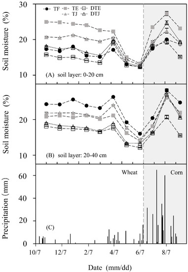 The precipitation and soil moisture contents of the different treatments during the experimental period are shown in Figure 1. Soil moisture content was consistently highest in the TE treatment for the 0–20 cm soil depth and lowest in the DTE treatment for the study period (Figure 1A, Table S1). Significant differences were exhibited between the treatments from sowing to elongation of winter wheat. Compared with the DTE treatment, soil moisture content was higher (p < 0.05) by 17.0–70.4% under TE treatment and by 7.9–44.3% under the TJ treatment. In the 20–40 cm depth (Figure 1B, Table S1), soil moisture content under the different treatments for the winter wheat period ranked as follows: TF > TJ > TE > DTJ > DTE. During the corn growth period, soil moisture was highest under TF and lowest under DTE treatment (p < 0.05).