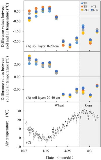 Differences in soil and atmospheric temperature varied significantly among the different treatments (Figure 2A,B, Table S2). In the 0–20 cm soil layer, the difference between soil and atmospheric temperature was significantly higher (p < 0.05) in TE than in the other treatments from sowing to overwintering and from elongation to grain-filling of wheat. The temperature difference was lowest in the TJ treatment at the corn period. The temperature difference under different treatments in the 20–40 cm soil layer was higher than those in the 0–20 cm soil layer across the treatments. In the 20–40 cm soil layer, temperature difference in the DTE and the DTJ treatments was significantly higher (p < 0.05) than in other treatments, and those in the TF treatment were lowest for the period from the sowing to the greening stage of wheat. Temperature difference in the TE and the TJ treatments were significantly higher (p < 0.05) than in the other treatments for the corn period.