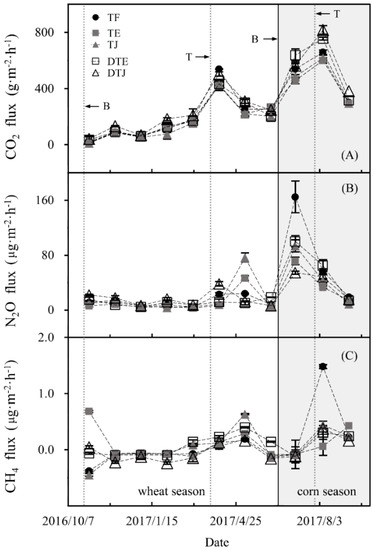 GHG fluxes (CO2 (A), N2O (B), CH4 (C)) in the experimental periods under different treatments. The vertical bars represent standard errors (n = 3). B and T: the dates of base fertilizer applications and top dressings, respectively. TF: rotary tillage with chemical fertilizer; TE: rotary tillage with ETS plus 70% chemical fertilizer; TJ: rotary tillage with JS plus 70% chemical fertilizer; DTE: deep plowing with ETS plus 70% chemical fertilizer; DTJ: deep plowing with JS plus 70% chemical fertilizer.