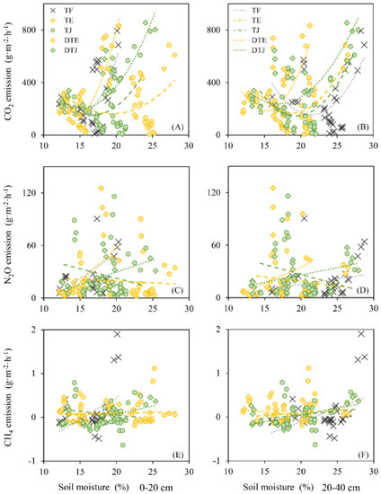 Scatterplots between CO2 emission and soil moisture at 0–20 cm (A) and 20–40 cm (B) depth; between N2O emission and soil moisture at 0–20 cm (C) and 20–40 cm (D) depth; and between CH4 emission and soil moisture at 0–20 cm (E) and 20–40 cm (F) depth under different treatments. TF: rotary tillage with chemical fertilizer; TE: rotary tillage with ETS plus 70% chemical fertilizer; TJ: rotary tillage with JS plus 70% chemical fertilizer; DTE: deep plowing with ETS plus 70% chemical fertilizer; DTJ: deep plowing with JS plus 70% chemical fertilizer.