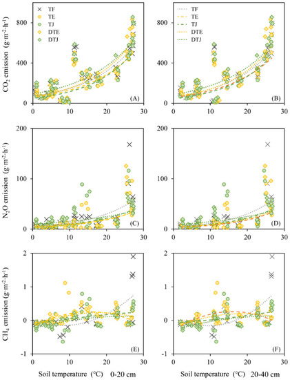 Scatterplots between CO2 emission and soil temperature at 0–20 cm (A) and 20–40 cm (B) depth; between N2O emission and soil temperature at 0–20 cm (C) and 20–40 cm (D) depth; and between CH4 emission and soil temperature at 0–20 cm (E) and 20–40 cm (F) depth under different treatments. TF: rotary tillage with chemical fertilizer; TE: rotary tillage with ETS plus 70% chemical fertilizer; TJ: rotary tillage with JS plus 70% chemical fertilizer; DTE: deep plowing with ETS plus 70% chemical fertilizer; DTJ: deep plowing with JS plus 70% chemical fertilizer.