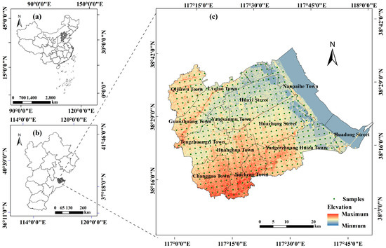 Figure 1. Location of Huanghua City (c) in Hebei Province (b), China (a).