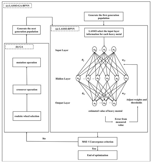 In this study, LASSO and GA are used to optimize BPNN. Specifically, we first select the appropriate input layer information for each heavy metal by LASSO. Then, the weight and threshold of BPNN are optimized by GA. Finally, BPNN is trained, and the LASSO-GA-BPNN model is constructed. The BPNN proposed by Rumelhart is a multilayer feedforward network trained by the error back propagation algorithm, it is suitable for the analysis of various nonlinear relations [44].