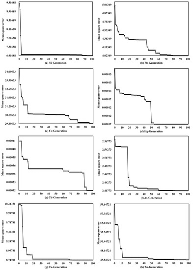 In the LASSO-GA-BPNN model of each heavy metal, the process of GA finding the best weight and threshold is shown in Figure 3a–h. The mean square error is the square of RMSE, which is used as the standard to select the optimal parameters. During the first 20 times of parameter optimization, the mean square error of each heavy metal estimation model decreased obviously. The mean square errors of Pb, Hg, As and Zn tend to be flat after 50 times of parameter optimization. The mean square errors of Cr and Cd tend to be flat after 90 times of parameter optimization. It shows that the LASSO-GA-BPNN model of each heavy metal can converge to the global optimum within 100 times of GA optimization. In general, the optimization process of the LASSO-GA-BPNN model by GA greatly improves the estimation accuracy, which is similar to previous research [45]. It can be judged that the optimization effect of GA is very obvious, which solves the defect that the steepest descent method is easy to fall into the local optimal solution. Therefore, combined with the previous analysis, the simultaneous optimization of BPNN by LASSO and GA can greatly improve the estimation accuracy and generalization ability.