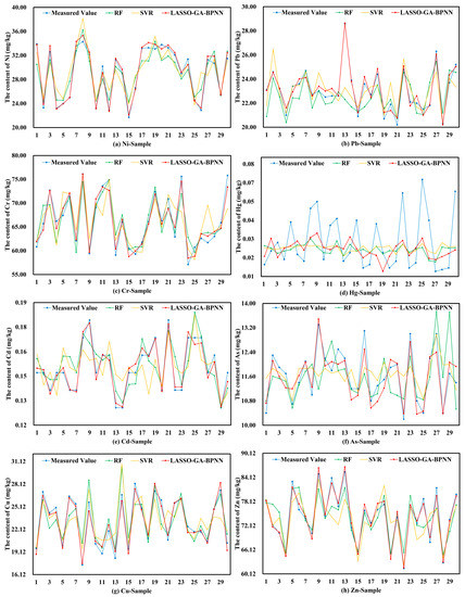 We randomly select 30 samples from the test set for each heavy metal. The fitting effect between the measured value and the estimated value of each heavy metal is shown in Figure 4a–h. There is an obvious gap between the estimated value and the measured value of Hg, and the fitting effect is poor. Besides, the fitting effect of other heavy metals by the three machine learning models is great, and the estimated value of each sample point is close to the measured value. In addition, the LASSO-GA-BPNN model has a better fitting effect than the SVR model and the RF model.