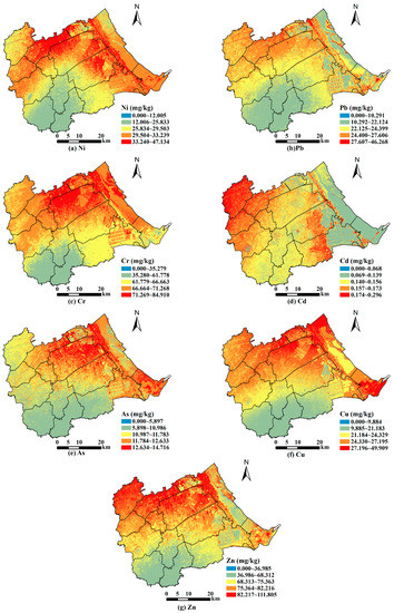 Figure 5. The spatial distribution of heavy metals in Huanghua ((ag) correspond to the elements of Ni, Pb, Cr, Cd, As, Cu and Zn, respectively).