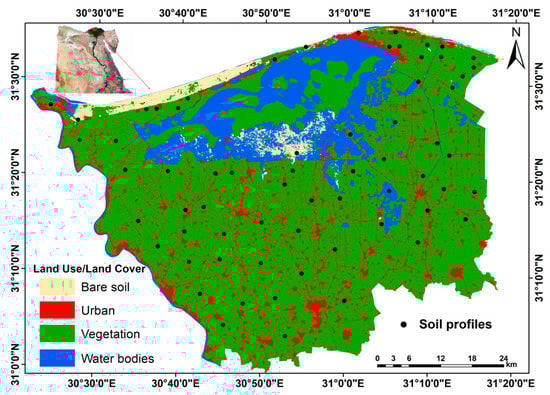 In Egypt, salinity accumulation, sodicity, and waterlogging are the main form of land degradation. Soil salinity and sodicity seriously affect agriculture production, where saline/sodic soils occupy 46% of the total Nile Delta area [74]. Egypt’s croplands are entirely irrigated due to the country’s extremely low rainfall and high rates of evaporation. The primary cause of secondary soil salinization in Egypt is the extensive irrigation of agriculture in arid climate conditions [74,75]. Additionally, irrigation with contaminated water from the polluted drains led to increasing in some metals’ concentration due to anthropogenic pollution through the spreading of contaminated dredged materials on agricultural fields [76]. The soil salinization problem in Egypt, caused by the reuse of irrigation drainage waters and limits on rice plantings due to the shortage of irrigation water, raises an urgent need for the agricultural productivity of the Nile Delta through, for instance, subsurface drainage in waterlogged lands, land leveling, and use of gypsum amendments [74]. Especially in Egypt, at least 20% of all irrigated areas are salt-affected, and other estimates put the figure as high as 50%. The northern part of the Nile Delta in Egypt contains a huge region of heavy clay soils with shallow open drainage, limited permeability, and low productivity.