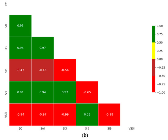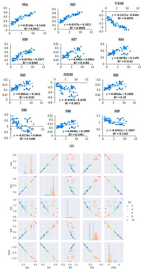 Our results indicate that the correlation between the remote-sensing spectral index and ECe (salinity index (SIA), salinity index 3, vegetation soil salinity index, and salinity index 9) was highly significant. This agrees with the views of [102,103] who emphasized that the salinity index (SI) has the highest correlation with soil salinity based on the image enhancement method. Elhag [104] indicated that the SI-3 and SI-9 have a high correlation with soil salinity indices.
