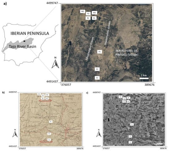 (a) Location of the study area in the Tajo River basin and the location of the sampling plots (R1, R2, E1, E2, M1, M2, P1, P2), using orthophotography PNOA 2017; (b) location of the study area in topographic map 1915; (c) location of the study area via ortophotography OLISTAT 1997–1998, before afforestation. Coordinates: UTM zone 30N, Datum ETRS89.