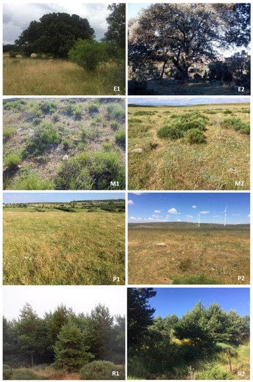 Sampling plots with the different types of vegetation: pine forest (recent afforestation) (R1,R2), holm oak forest (E1,E2), shrubs (M1,M2), and grasslands (P1,P2).