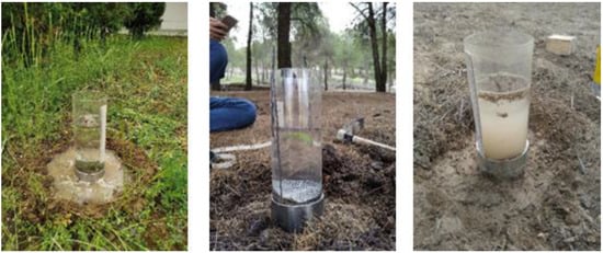Infiltration is a complex hydrological process that consists of the vertical entry of water into the soil. During the process, the water potential, capillary forces, and gravitational gradients are controlled, and they are related to soil water content and pore structure, among other soil characteristics []. Infiltration is one of the main components of the hydrological cycle. It is a main factor in the regulation and maintenance of ecological relationships in water-dependent terrestrial ecosystems []. Soil infiltrability (or infiltration capacity) is the maximum capacity of soil to infiltrate surface water in a unit of time (L∙m−2∙min−1, mm∙h−1), and it is estimated by the soil infiltration rate [,]. Quantifying the soil infiltration capacity is necessary to understand and model the hydrological regime of an area, and to assess soil erosion and its stability [], due to its close relationship with the hydrological functioning of the soil [] and the hydrological services of ecosystems []. Therefore, it is an important factor in land management and in the estimation of overland flow or groundwater [].
