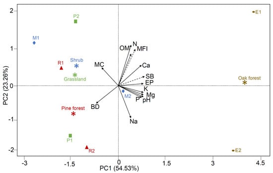 The first two factors (PC1 and PC2) of the PCA with soil data explained 77.80% of the total variation. PC1 was negatively correlated with BD (−0.83) and MC (−0.63) and positively correlated with the rest of the variables, particularly with Mg (0.88), K (0.87), EP (0.87), pH (0.84), Ca (0.83), P (0.83), and SB (0.94) (Table 2). PC2 was negatively correlated with Na (−0.74) and positively correlated with N (0.87), MFI (0.80), and OM (0.70).