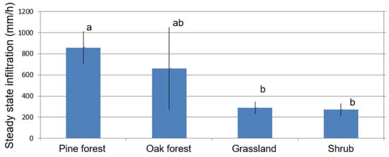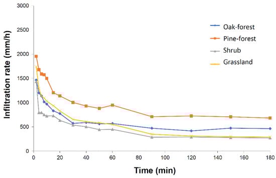 Figure 6 shows the infiltration curves for the different land uses. The initial soil infiltration rate did not present significant differences for the four types of vegetation. However, the steady-state infiltration rate presented significant differences, for a probability of 99% (p-value < 0.0001), with pine afforestation at the highest rate, followed by native holm oak, grasslands, and shrubs (Figure 7).