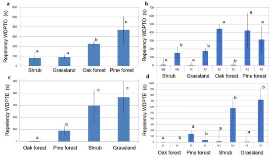 Mean plot of the soil repellency for the vegetation types (left) and for sampling plots (right). Error bars represent 95% confidence intervals. Different letters mean statistically significant differences, α = 0.05, between the vegetation types in (a,c), and between plots within each vegetation type in (b,d).