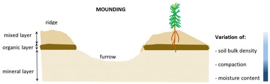 In addition, the lower organic matter content in pine afforestation areas, compared with the content in shrub and grassland areas, could be explained by the MSP that was carried out, which caused surficial ridges, or mounding []. For instance, Jandl et al. [] reported that, in general, there was a loss of carbon from soil following the MSP. In fact, mounding removed the surficial centimeters of the soil, which are richer in OM, which were mixed with the deeper mineral fraction, resulting in their accumulation at the top of the ridges. Then, the bottom of the furrows remained, without OM but with a higher soil bulk density, while the top of the ridges became poorer in OM with a lower soil bulk density than before the site preparation (Figure 9). For this reason, pine afforestation causes a reduction in OM in the short term, but in the medium or long term it is expected that OM will recover because of the permanent contribution of litter from the canopy tree.