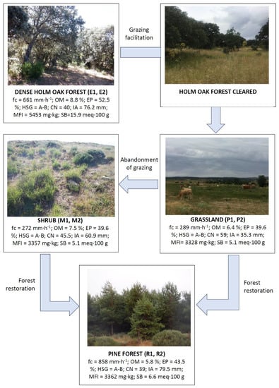 Currently, there is a lack of information on the recovery of soil infiltration capacity after forest restoration []. Several studies have reported how different factors, such as soil texture and structure, grassland use, soil type, and vegetation, affect soil infiltration rates [], but the influence of these factors and forestation in the recovery of soil infiltration capacity is still not well understood []. Therefore, the main objective of this work is to compare different land uses and the results of historic land management practices in a mountainous area in central Spain (with a focus on native holm oak forest, shrubs, and pasture) with a recent pine afforestation area, in terms of the hydrological conditions (infiltration, NRCS hydrologic groups, and repellency) and other physical and chemical properties of the soil. Our hypothesis is that afforestation with Pinus species contributes to soil improvement, recovering hydrological and edaphic properties that were lost when the native holm oak forest was turned to grasslands or to shrub vegetation.