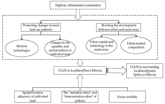 CLUE essentially refers to obtaining as much output as possible with as little resource input as possible. Under the realistic background of limited arable land resources which are occupied and turned into construction land to support urban development, improving the CLUE is the “key pulse” of agricultural development. According to the theory of spatial econometrics [], the impact of highway infrastructure construction on CLUE can be divided into the direct effect on the local unit and the spatial spillover effect on the surrounding unit. This paper summarizes the effect of highway infrastructure construction on CLUE with the following aspects (Figure 1).